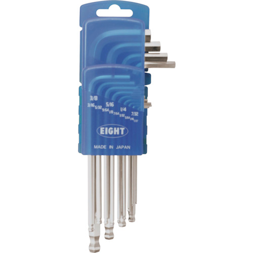 (株)エイト 品番:TLS-13ZD エイト 六角棒スパナ テーパー ロングドアホルダー 13本 1/20~3/8 特長テーパーヘッドは本締に使える様、耐久性と耐摩性を一段と向上しました。従来のボールポイントに比べ10から20%ねじり強度が高く、傾けての使用(0から20°)で特に効果を発揮します。ドアホルダーはレンチとホルダーの抵抗が無く、出し入れが楽々です。使用後は、扉を閉めるだけで
