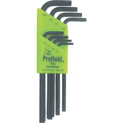 ボンダス・ジャパン(株) 品番:PHTX8 ボンダス プロホールド[[R]]トルクス[[R]](ネジつかみ機能付L-レンチ)セット) セット8本組(T9-T40) 特長ネジを傷つけないネジを保持できるトルクスレンチです。マグネットではないので鉄くずを拾いません。用途トルクス[[R]]ネジの締付け緩め作業に。緩めたネジをつかんで、手元に運ぶ作業に最適。指の届かない狭いところにあるネジに。高所や天
