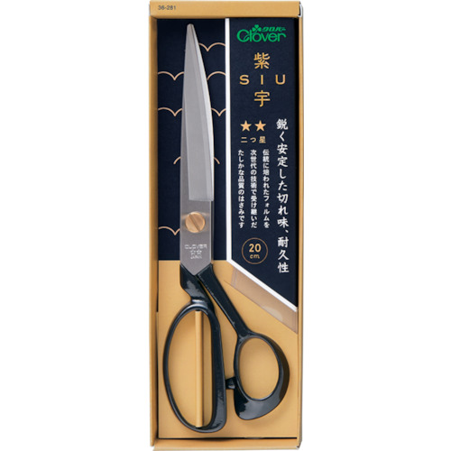 クロバー(株) 品番:36-281 クロバー 布切はさみ 紫宇 二つ星 20cm 特長反り、捻りを切削研磨だけで形成しました。歪がなく、長期使用に耐えます。小刃角度を均一化しました。個々のバラつきがなく、擦り合いに対する耐久性がアップしています。焼入れをブレード全体に行い、硬度を均一化しています。内刃と峰(側面)にバフ磨きをしています。美しい質感とスムーズな開閉による快適な使い心地を追究してい