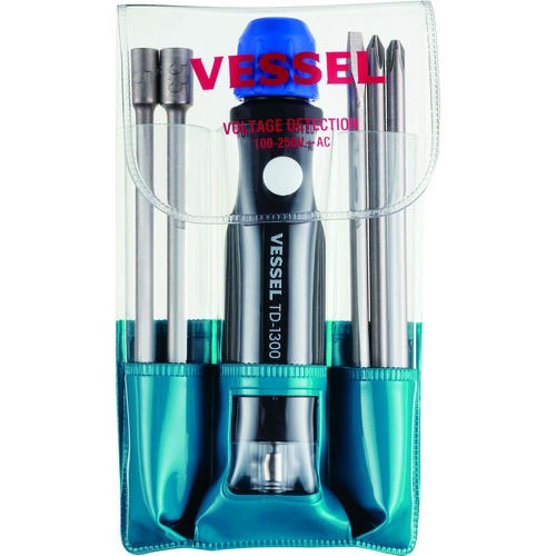 (株)ベッセル 品番:TD-1300B ベッセル 検電差替5本組ドライバーセット(低圧用)TD-1300B 特長低圧用検電ドライバーのセットです。一般家庭や工場における電気製品の電源の通電チェックができます。ハンドル内部のネオンが光って通電を確認できます。差替えが簡単なチャック式ハンドルで、よく使用されるナットサイズ(H5、H5.5mm)をセットしました。携帯・収納に便利なビニールケース入りで
