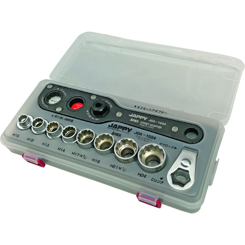因幡電機産業(株) 品番:JOA-1024 JAPPY オフセットアダプターセット 特長電動ドリルや手が入らない狭い箇所でのボルトやナットの締め作業も電動ドリルで楽に作業が可能です。18Vのインパクトドライバーにも対応可能です。8種類の付属ソケットで多種のボルトナットに対応可能です。付属のギアロックを使えば手締め作業も可能です。用途電動ドリルや手が入らない狭い箇所でのボルトやナットの締め作業時