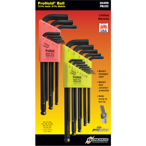 ボンダス・ジャパン(株) 品番:PBLX22 ボンダス マルチパック PBLX9M&PBLX13 プロホールド 特長PBLX9MとPBLX13のセットです。商品スペック仕様・規格プロガード黒染め加工処理対辺寸法(mm):1.5、2、2.5、3、4、5、6、8、10セット内容(インチ):PBLX13:0.050、1/16、5/64、3/32、7/64、1/8、9/64、5/32、3/16、7/3