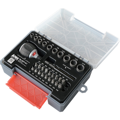 アネックスツール(株) 品番:307-S1 アネックス ミニスタ72 ラチェットドライバーセット 特長スタービータイプのラチェットドライバーで狭い所のネジ回しができます。強力本締め・軽い早回しのラチェット機構です。ビットの延長ができ、ネジをしっかりキャッチできる強力マグネットホルダーをセットしています。超短ビットは全28サイズで様々なネジに対応します。極厚設計3mmの頑丈なPP収納ケースです。