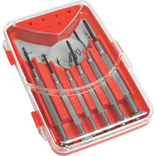 (株)ワールドツール 品番:2002000024428 アストロプロダクツ 精密ドライバー 6本セット 特長メガネや時計、精密機器などの小さなネジを回す、精密ドライバーのセットです。グリップエンドが回転するので、簡単に早回しが可能です。収納に便利なケース付きで、作業時にはドライバーを立てるスタンドとしても使用できます。商品スペック仕様・規格[PH00]全長:89mm、重量:9g、軸長:22mm