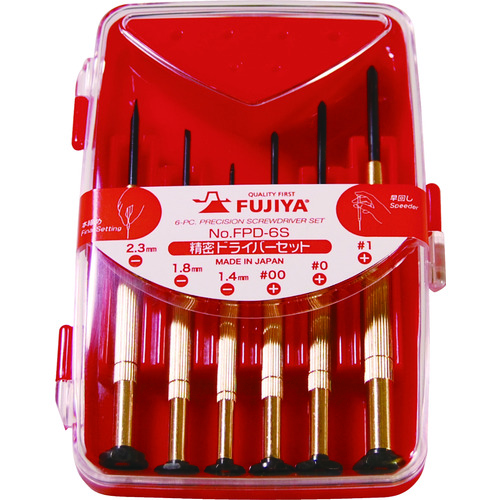 フジ矢(株) 品番:FPD-6S フジ矢 FPD-6S 精密ドライバーセット6本組 特長ハンドル部は防錆効果に優れた真鍮素材を使用しています。微細作業に「回転ヘッド」の使用で楽に早回しが可能です。用途メガネ・時計・カメラなどの組立や修理作業に。商品スペック仕様・規格セット内容(本):6セット内容:(+)No.00、No.0、No.1、(-)1.4、1.8、2.3材質軸:炭素工具鋼グリップ:真鍮