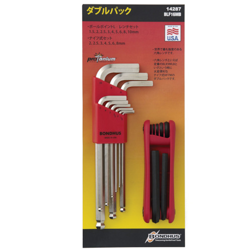 ボンダス・ジャパン(株) 品番:BLF16MB ボンダス ダブルパック(BLX9MLB + HF7M) 特長定番のミリ9本組L-レンチセットと、いざという時に大変便利なナイフ式セットをパックにしました。用途六角穴付ボルトの締め付け、緩め作業に。商品スペック仕様・規格セット内容:【BLX9MLB】1.5、2、2.5、3、4、5、6、8、10mm、【HF7M】2、2.5、3、4、5、6、8mm形状