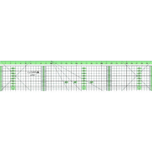 クロバー(株) 品番:57-940 クロバー カッティング定規 カラーライン30cm 特長ロータリーカッターなどを使い布や紙をカットするのに便利です。滑り止めが定規の端に付いているので、カットの時に布や定規がずれにくい。滑りとめが透明なので目盛やラインを合わせる妨げにならない。ステンレスエッジがついているのでロータリーカッターでカットする時、定規のエッジを傷める心配がありません。カラーラインは