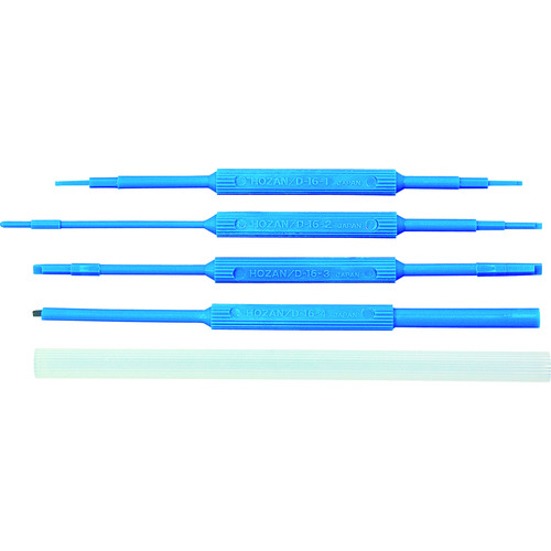 ホーザン(株) 品番:D-16 HOZAN コアドライバーセット(5本組) 特長フェライトコアと半固定ボリューム(つまみ付・つまみなし)の調整用ドライバーです。材質は高絶縁・耐摩耗性に優れたポリアセタールを使用し、コアを傷めず、調整ズレもありません。用途フェライトコアと半固定ボリュームの調整に。商品スペック仕様・規格完全非磁性REACH対応セット内容(本):5セット内容:D-16-1B、D-1