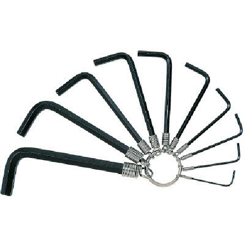旭金属工業(株) 品番:ARSE-110 ASH リング式六角棒レンチセットインチサイズ10本組 特長携帯に便利なリング式です。キーホルダー感覚であらゆる所にかけられます。用途六角穴付きボルト・六角穴付き止めネジの締結作業。商品スペック仕様・規格リング式六角棒レンチセット内容:1/16、5/64、3/32、1/8、5/32、3/16、7/32、1/4、5/16、3/8(インチ)組数(本):10