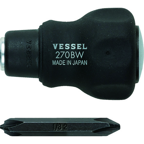 (株)ベッセル 品番:270BW-123 ベッセル コンビプラス スタビードライバー No.270BW-123(+1・+3/+2) 特長電動ドライバー用ビット(対辺6.35mm)を差し込んで、ハンドドライバーとして使用できる“クッションスタビー差替グリップ”と、3サイズに対応する“コンビPLUS”ビットのセットです。グリップは狭い箇所に最適なスタビータイプです。ビットは(+)1、2、3の3サイ