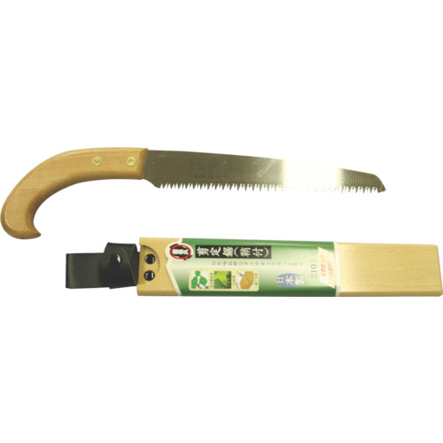 浅香工業(株) 品番:153334 金象 宝長久 剪定鋸鞘付 210 特長鋸身は、焼入鋼帯を使用し、刃先に衝撃焼入れを施すことにより、硬度・切れ味・持続性がアップします。グリップ部はサクラ材にニス塗を施しています。用途生木の剪定、工作等。商品スペック仕様・規格全長345mm刃の長さ210mmグリップ長さ130mmグリップ厚み1.8mm鋸身厚さ0.8mm刃長(mm):210全長(mm):345材