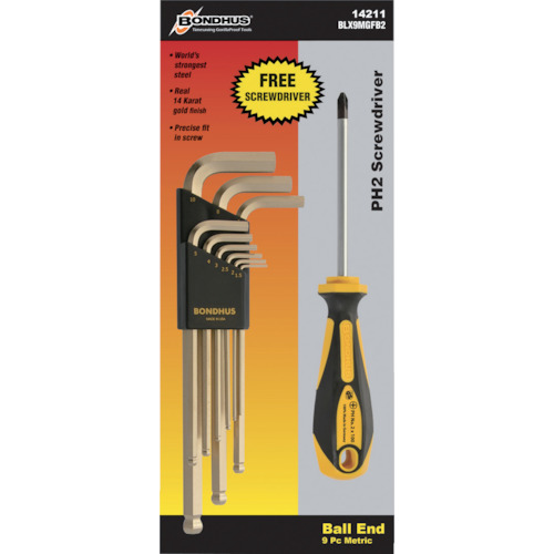 ボンダス・ジャパン(株) 品番:BLX9MGFB2 ボンダス 六角Lレンチ ゴールドガード9本組&+2×100 コンボセット 特長ボンダスドライバー発売記念限定パックです。用途六角穴付ボルトの締め付け、緩め作業に。商品スペック仕様・規格硬度:HRC57~61表面処理:ゴールドガード(14kメッキ)材質六角L-レンチ:プロテニアム(R)合金鋼(ボンダス特注鋼材)ドライバー:クロムバナジウムモリブ
