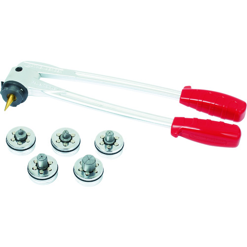 ローデンベルガー 品番:R12517 ローデン エキスパンダパワートルクPR5型セット 特長ワンタッチでヘッドの着脱が可能です。パワートルク機構で、従来品の半分の力で拡管ができます。強度と耐久性に優れた鍛造アルミ製軽量ボディーです。長い拡管部とリベット(鋲)固定のヘッドが同芯上に広がるため加工精度が良く、ろう付けに最適なすき間を作ります。テーパーピンはチタンコーティングのため、摩耗に強く長寿命