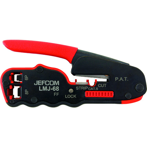 ジェフコム(株) 品番:LMJ-68 デンサン コンパクトモジュラー圧着工具 特長モジュラー圧着作業(6P、8P)をコンパクトに集約できます。反復バネ付で連続作業がしやすいです。コンパクトサイズで持ち運びに便利です。ロックボタン付です。コード切断、皮むき、圧着が1丁でできます。標準モジュラープラグ6P(RJ11)、8P(RJ45)用です。※メーカーが独自に拡張したプラグには対応できない場合があ