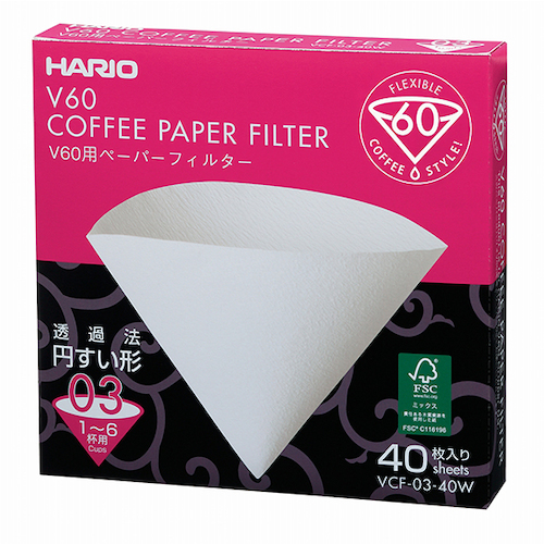ハリオサイエンス(株) 品番:VCF-03-40W HARIO V60用ペーパーフィルター03W 40枚入り 特長V60シリーズペーパーフィルターです。03タイプ(1~6杯用)のペーパーフィルターです。材質はパルプ100%の酸素漂白仕様です。商品スペック仕様・規格色:ホワイト3箱40枚入材質天然パルプ質量・質量単位70g使用条件-注意事項-セット内容・付属品-製造国日本小箱入数小箱入数とは、発