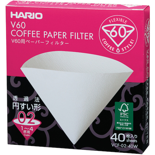 ハリオサイエンス(株) 品番:VCF-02-40W HARIO V60用ペーパーフィルター02W 40枚入り 特長V60シリーズペーパーフィルターです。02タイプ(1~4杯用)のペーパーフィルターです。材質はパルプ100%の酸素漂白仕様です。商品スペック仕様・規格色:ホワイト2箱40枚入材質天然パルプ質量・質量単位50g使用条件-注意事項-セット内容・付属品-製造国日本小箱入数小箱入数とは、発