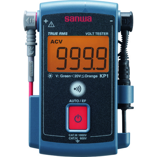 三和電気計器(株) 品番:KP1 SANWA ボルトテスター 特長安全に使えるCAT.IV600V対応しています。より簡単な測定でACV/DCVを自動判別、ファンクション間違いによる誤測定やうっかりミスで起こるブレーカートリップも軽減します。診断モード搭載-リード断線や表示器故障をいつでもチェック検電機能(EF)は接触方式と非接触方式の2種類、検電状態が分かりやすいバー表示とブザー音で判断可能