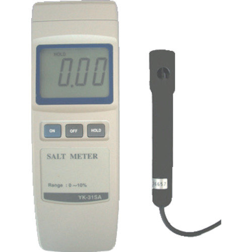 アズワン(株) 品番:1-6556-01 AS デジタル塩分濃度計 YK-31SA 特長自動温度補正により正確な塩分濃度を測定します。表示部は防水仕様です。用途測定方式:導電率測定方式精度:±0.5%(23±5℃)温度補正:0~50℃(自動)自動温度補正機能・データホールド機能・電池消耗表示機能付き電源:006P(9V)電池×1個(テスト用付属)材質:ABS樹脂サイ