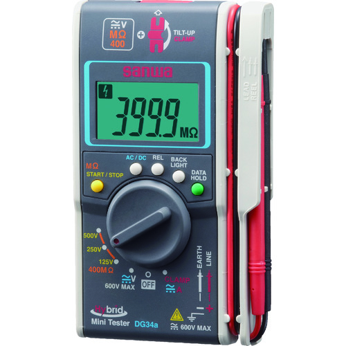 三和電気計器(株) 品番:DG34A SANWA メグオームテスタ(3レンジ絶縁抵抗計+クランプ) 特長ポケットサイズの絶縁抵抗計と直流/交流両用クランプメーターの複合機です。クランプセンサーは0~180°まで角度調節可能です。薄さ7mmのU字型で、クランプ径はφ10mmです。表示部はELバックライト搭載で暗所でも見やすいです。ポケットサイズの3レンジ絶縁抵抗計と直流/交流両用クランプ
