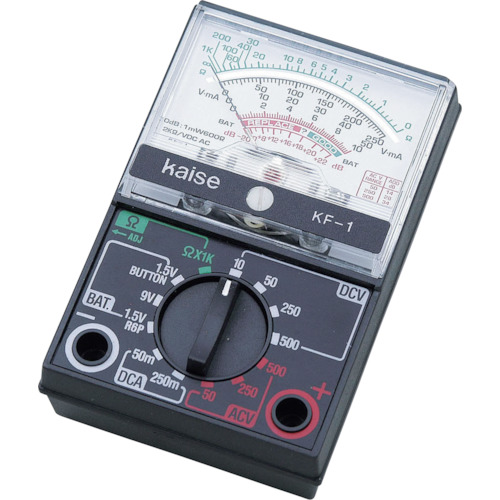 朝日電器(株) 品番:KF-1 ELPA ミニテスター 特長デシベルの測定やトランジスタ測定もできる多機能型電池チェックレンジ付で電池の消耗もチェックできます。回路保護用ヒューズ付。商品スペック仕様・規格電力:単三形乾電池×1本直流電圧:10/50/250/500V(2kΩ/V)交流電圧:50/250/500V(2kΩ/V)直流電流:50/250mA抵抗:×1kレンジにて0~1MΩ電池チェック