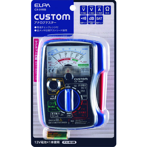 朝日電器(株) 品番:CX-04MB ELPA アナログテスター 特長背面の内蔵マグネットで本体を固定できます。ブザーとLEDで知らせる導通チェック機能があります。1.5Vと9V電池のチェックができます。商品スペック仕様・規格直流電圧:10/50/250/500V交流電圧:50/250/500V直流電流:25m/250mA抵抗:×10(20kΩ)/×1K(2MΩ)導通試験:約150Ω以下でブザ