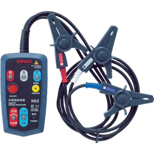 三和電気計器(株) 品番:KS2 SANWA 非接触検相器 特長被覆線上から三相交流電源の検相と欠相のチェックが可能です。非接触式の静電誘導式測定クリップを採用しています。明るい場所でも表示を見やすくする「高輝度ボタン」を採用しています。安全規格:IEC61010CAT31000V、CAT4600V適合品です。被覆上から安全に測定できます。三相電路の相順(正相・逆相)と活線状態の確認が可能です
