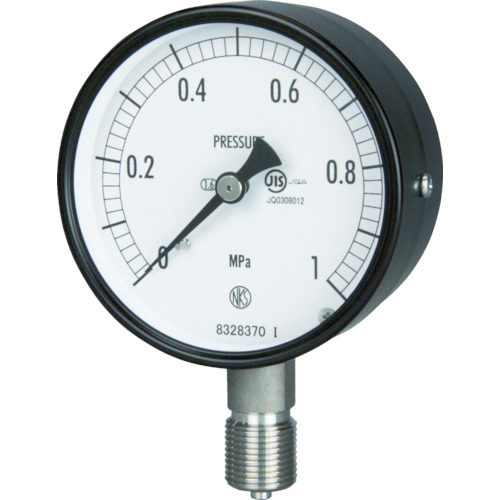 長野計器(株) 品番:AC10-133-4.0MP 長野 普通形圧力計 特長耐食性を要求される場合にも対応できます。JISB7505規格品です。商品スペック仕様・規格圧力レンジ(MPa):0.0~4.00最小目盛(MPa):0.100精度:±1.6%FSケース形状:A接続部サイズ:G3/8B大きさ(mm):75材質ブルドン管:ステンレス(SUS316)株:ステンレスSUS316(