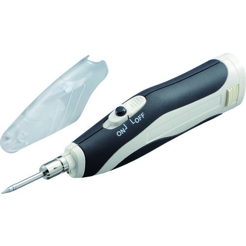 太洋電機産業(株) 品番:MSD-20 グット 電池式はんだこて 電源の無い車内やガス式の使用ができない工場内でも使用可能特長電源の無い車内やガス式の使用できない工場内でも使用可能です。単3電池3本でいつでもはんだ付け作業が行えます。充電式電池も使用可能で、経済的です。前方についたLEDで作業を明るく照らします。約15秒で350℃まで到達。すぐに作業できます。※新品電池を使用した場合。キャップ