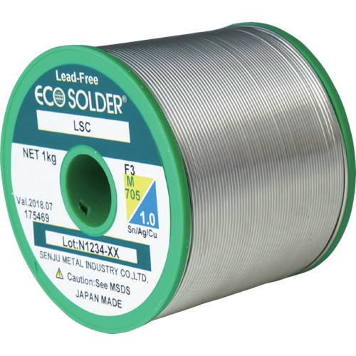 千住金属工業(株) 品番:LSC F3 M705 0.3 D250G 千住金属 エコソルダー LSC F3 M705 0.3ミリ 250g巻 特長JISAA級の最新版やに入りはんだです。飛散性を抑えロボットのはんだ付けにも適しています。用途精密電気・電子機器の配線・接続。商品スペック仕様・規格線径(mm):0.3融点(℃):217~220フラックス:JISAA級RMA級材質合金組成(すず:96