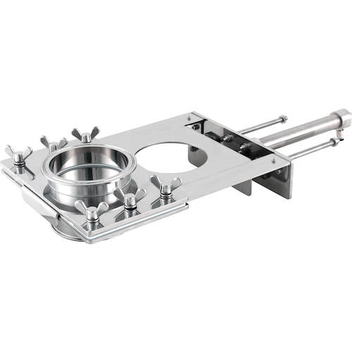 日東金属工業(株) 品番:SH-A-100A 日東 空圧式シャッター弁 100A 特長粉粒体専用のシャッター式バルブです。エアーシリンダを搭載し、空圧で自動開閉できます。粉体、粒体の充填工程、原材料の投入工程などで活躍します。外装部品はオールステンレス、さらにシリンダ可動部に設けられたスクレーパによりシリンダ内部への水の侵入を防ぐ構造になっています。食品製造工程など、水滴がかかってしまう可能性