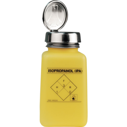 DESCO JAPAN(株) 品番:35278 DESCO 静電気拡散性ボトル 黄色 ワンタッチ HDPE 180cc「IPA」の印刷 特長高密度ポリエチレン(HDPE)のボトルは静電気拡散性で、静電気に敏感なプリント回路を保護します。ボトルによって内部の液体が汚染されることがありません。ワンタッチポンプ、フタの部分の皿の真ん中に入れ口があるので、液体がボトルの中に戻ることが可能です。1回ポン