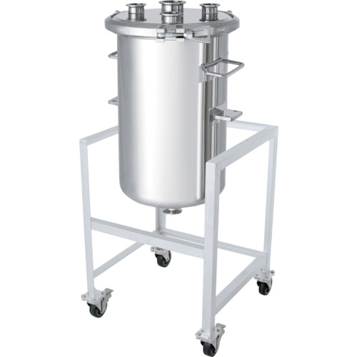 日東金属工業(株) 品番:PCN-F-ASC-30 日東 へルールオープン加圧容器 架台付 30L 特長移動しやすい架台が付いたステンレス容器です。口径と容器内径が同じストレートタイプの圧力容器です。下部排出の為、内容物が残留なく排出できます。作業に合わせて工具不要で容器と架台の分離・固定ができます。容器を架台から外して洗浄できるので、洗浄時間の短縮になります。容器と架台は丈夫でサビに強いSU