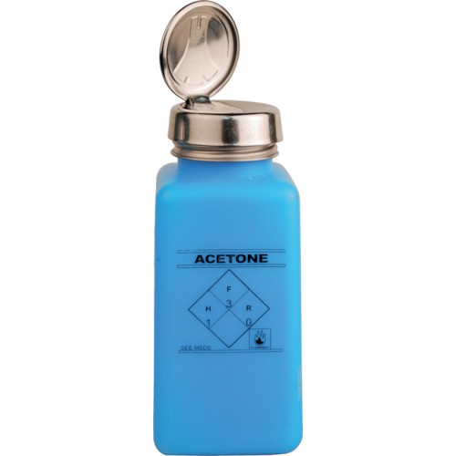 DESCO JAPAN(株) 品番:35288 DESCO 静電気拡散性ボトル 青色 ワンタッチ HDPE 240cc 「ACETONE」の印刷 特長高密度ポリエチレン(HDPE)のボトルは静電気拡散性で、静電気に敏感なプリント回路を保護します。ボトルによって内部の液体が汚染されることがありません。ワンタッチポンプ、フタの部分の皿の真ん中に入れ口があるので、液体がボトルの中に戻ることが可能です