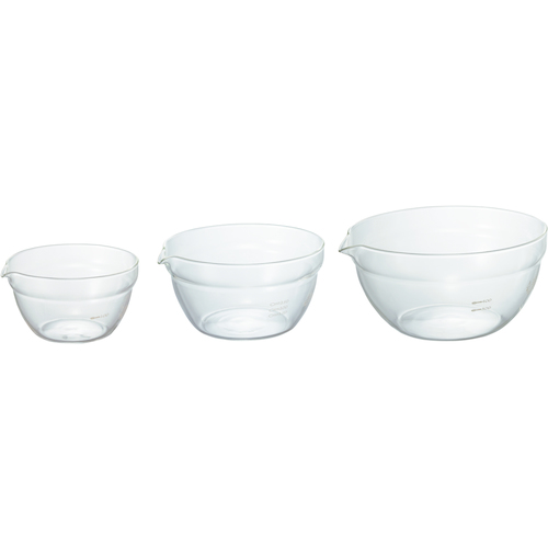 ハリオサイエンス(株) 品番:KB-1318 HARIO 片口ボール3個セット 特長調理やお菓子作りに便利な注ぎ口の付いた片口ボールの3個セットです。耐熱ガラス製なので、混ぜる・注ぐだけでなく、電子レンジでの下ごしらえも可能です。商品スペック仕様・規格実用容量M:400mlS:200mlSS:100ml材質本体:耐熱ガラス質量・質量単位335g使用条件-注意事項電子レンジ・食洗機はご使用