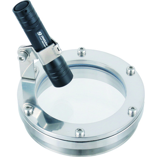 日東金属工業(株) 品番:NMB-LA-2S 日東 のぞき窓(一体型)ライト・アーム付 2S 特長容器等のへルールに取り付けることで、容器内部の状態を確認できます。低発熱、高輝度のLEDライトが容器内部を明るく照らします。ライトは電池式で窓に取り付けられるので、電源コードが不要で持ち歩きできます。ライトの照射角度が調節でき、見たい位置へ光を当てられます。窓をへルールから取り外す際に、ガラスが脱