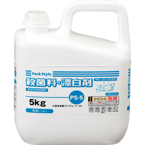 (株)折兼 品番:438482 パックスタイル PS-5 殺菌・漂白剤 5kg. 特長まな板などの調理から器具やふきんの殺菌・漂白のほか、野菜の殺菌にもお使いいただけます。次亜塩素酸ナトリウム5~6%の食品添加物なので、安心です。希釈倍率目安はふきんやまな板の場合60倍(有効塩素濃度1000ppm)、野菜や果物類の場合は300倍(有効塩素濃度200ppm)です。商品スペック仕様・規格外形寸法(