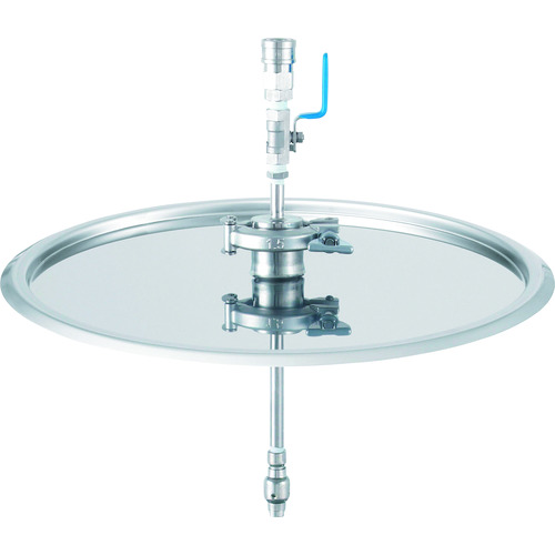 日東金属工業(株) 品番:CF-CN-36 日東 容器洗浄ノズル付蓋 36用【CF-CN】 特長水圧によってシャワーノズルが回転し、容器内面を洗浄します。洗浄液を容器内面にしっかり当てられる、5~10rpm(0.3MPa時)の低速回転です。洗浄ノズルと蓋は分解・組立しやすいヘルール接続です。流入口はスムーズに着脱できるようカプラ(カプリング)になっています。【CF-CN】は、CTL蓋【CF】と