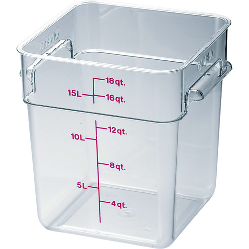 遠藤商事(株) 品番:AHC03018 TKG キャンブロ 角型フードコンテナークリアー 18SFSCW 特長洗浄機対応丸型のものに比べて、収納スペースが33%も増えました。本体が透明なので、一目で中身が分かります。丈夫なポリカーボネイト製で、耐久性に優れています。本体の外側に目盛りが付いているので、中身の量がすぐ分かります。カバーにはタブが付き、開けやすくなっています。カバーの色と目盛の色が