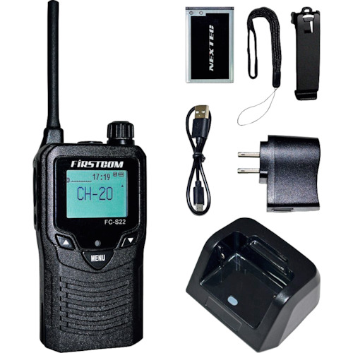 (株)エフ・アール・シー 品番:FC-S22(W) F.R.C. 薄型 特定小電力トランシーバー 特長スマートだけど高機能の充電式、薄型、軽量トランシーバーです。38グループモードやハンズフリー機能(VOX)、オートパワーオフにキーロック機能といったトランシーバーの標準機能に加え「FMラジオ(ワイドFM対応)」「録音再生機能」「高輝度LEDライト」を搭載しています。他のトランシーバーには無い機