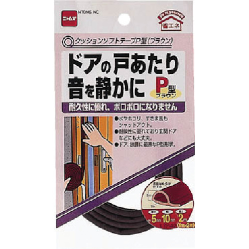 (株)ニトムズ 品番:E0142 ニトムズ クッションテープP型(ブラウン) 特長耐久性に優れ、ぼろぼろになりません水やホコリ、すきま風もシャットアウト耐侯性に優れており玄関ドアなどにも大丈夫ドア・鉄壁に最適なP型形状接着力:14.0N/25mm用途ドアの戸あたり音を静かに。水やホコリ、すきま風もシャットアウト。商品スペック仕様・規格色:ブラウン厚さ×幅×長さ(mm):5×10×1000材質基