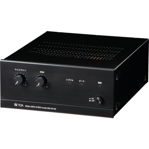 TOA(株) 品番:BG-M130 TOA BGM用アンプ 30W 特長小規模店舗などでのBGM用途に最適な3入力・30Wのアンプです。マイク/ライン入力(切換式)に音声信号が入った時や、ミュート端子を短絡した時にBGM入力と予備入力の音量が小さくなるミュート機能を備えています。商品スペック仕様・規格BGM用アンプ30W材質パネル:ABS樹脂 ヘアライン●ケース:鋼板質量・質量単位4kg使用条