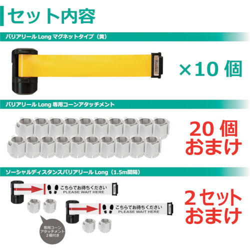 中発販売(株) 品番:BRS-606P10P3M Reelex バリアリールLong3密対策セット 特長バリアリールLongマグネットタイプ(黄)が10個セットになっています。●安全コーンで使用できる専用コーンアタッチメント×20個と、ソーシャルディスタンスバリアリールLong(1.5m間隔)×2セットのおまけが付いた大変お得なセットです。必要な長さでフレキシブルに設置可能です。シートは自動巻
