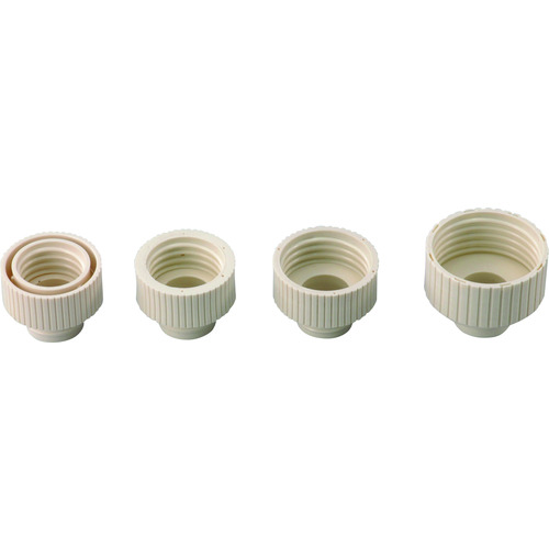 柴田科学(株) 品番:025110-111 SIBATA 試薬びん取付用アダプターセット 特長リビューレットに一般試薬びんやガロンびん等を直接接続して分注できるようにするオプション部品セットです。28mm、32mm、38mm、45mmの各ねじサイズに合ったびんと組み合わせて使用することが可能です。30cmのインレットチューブも付属しているので、びんの容量サイズに応じた長さに調整して使用します。