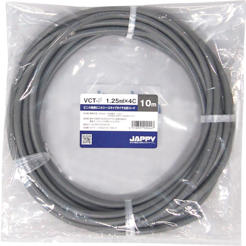 因幡電機産業(株) 品番:VCT-F 1.25SQX 4C 50M JP JAPPY キャブタイヤ丸形コード 特長必要なときに必要な量だけお求めできる短尺サイズです。用途屋内で使用する300V以下の小型電気器具の電源コードとして。商品スペック仕様・規格導体構成:50本/0.18mm導体外径:1.5mm絶縁体標準厚:0.6mmシース標準厚:1.0mmシース色:灰色仕上外径:8.5mm使用温度(