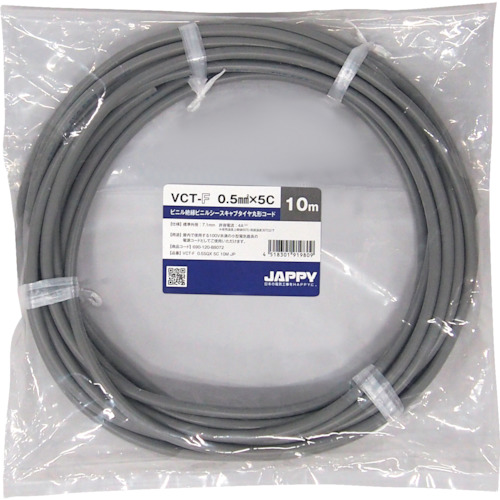 因幡電機産業(株) 品番:VCT-F 0.5SQX 5C 20M JP JAPPY キャブタイヤ丸形コード 特長必要なときに必要な量だけお求めできる短尺サイズです。用途屋内で使用する100V未満の小型電気器具の電源コードとして。商品スペック仕様・規格導体構成:20本/0.18mm導体外径:0.9mm絶縁体標準厚:0.5mmシース標準厚:1.0mmシース色:灰色仕上外径:7.1mm使用温度(最