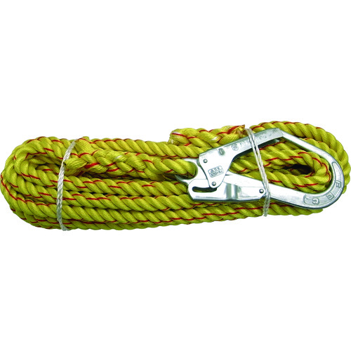 まつうら工業(株) 品番:NEW-TETORON-1610 まつうら ニューテトロン親綱(垂直用) 16mmΦ×10m 片側フック付 特長ニューテトロンロープは収縮・硬化が少なく、耐摩耗性に優れ、含水時の強度低下がほとんどないので、建設工事・塗装工事等の高所作業を安全にするために親綱ロープとして開発された高性能ロープです。片側大口径(50mm)フック付のニューテトロンロープ16mmΦ(3ツ打ち