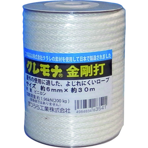 まつうら工業(株) 品番:KMKG-630B まつうら クレモナ金剛打(12打ち) 6mmΦ×30m ボビン巻 特長(株)クラレの素材を使用した日本製です。用途シートやテントの固定や結束に。商品スペック仕様・規格径(mm):6長さ(m):30線径(mm):6カラー:白切断荷重(kN):約1.96(約200kgf)ロープ仕様1:12打ち(12ストランド、芯入)ロープ仕様2:ボビン巻色:白材質材質