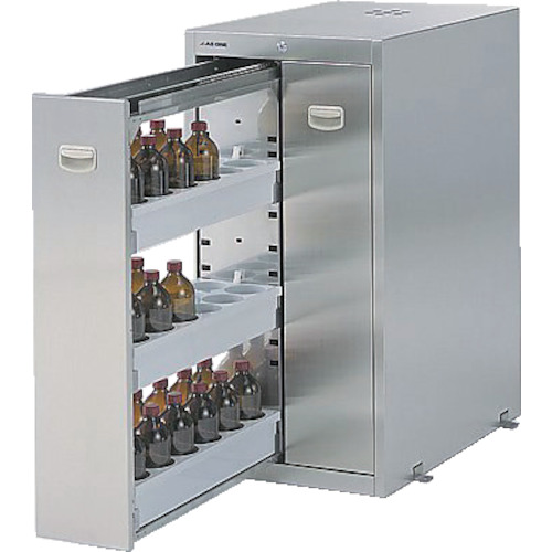 アズワン(株) 品番:3-4462-21 AS 耐震ステンレス薬品庫 SS-945S4 特長ボトルプロテクターが試薬瓶を確実に固定し、地震の際の破損を防ぎます。鍵付きですので、薬品の管理に適しています。付属の連結具で左右に連結できますので、自由な組み合わせが可能です。SN-1845S4>スライド収納部分のロック装置により、地震で引出が自然に開くことを防止します。片方を開けるともう片方にはストッ