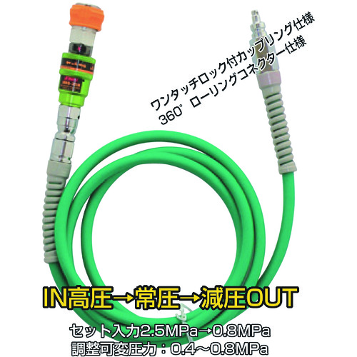 (株)近畿製作所 品番:K-HRG-25H 近畿 オンハンドレギュレーター 特長接続部に再度ソケットを付けなくてもホースエンドでOK!ローリングタイプ フリーに屈曲45°回転360°です。2.5MPaで本体に空気圧が入っても0.8MPa以下に落とします。(PAT.P)エアー源設置場所(コンプレッサー等)までの操作の為の移動無駄を失くします。2m高圧ホースは作業にぴったりの長さで