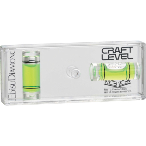 (株)エビス 品番:ED-CRA エビスダイヤモンド クラフトレベル 特長コンパクトで携帯に便利です。透明で目盛付なので、透かして測れます。全面が測定面としてご使用できます。直角定規としても使えます。樹脂製なので測定物に傷が付きにくいです。用途突張り棚等の壁面棚取付け作業の水平出しに。シェルフ、ラック等の足場調整時の平面出しに。額縁(横長・縦長)の掲示作業の水平出しに。商品スペック仕様・規格水